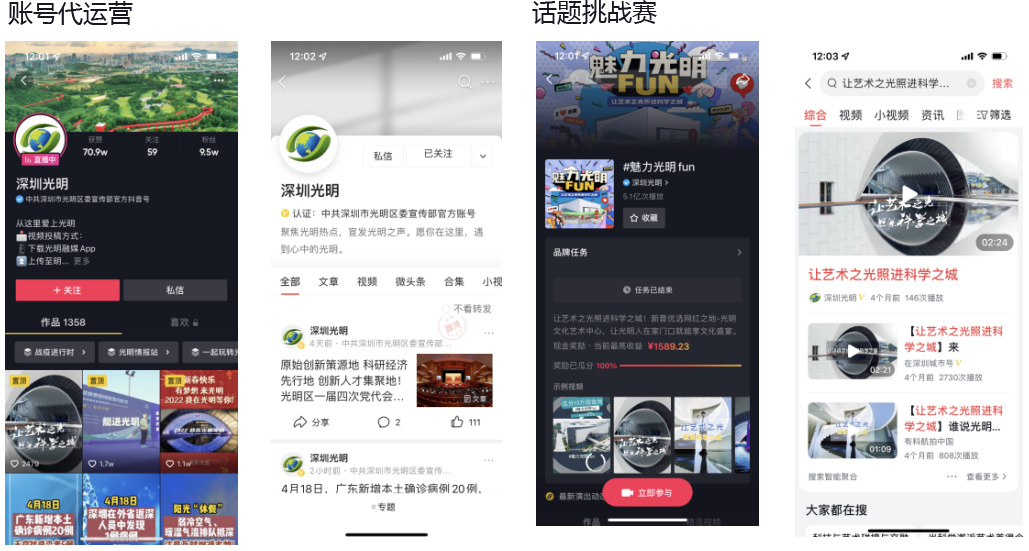 深圳靈豹目前已為(wèi)光(guāng)明(míng)區(↑±qū)委宣傳部服務【深圳光(guāng)明(m ≤★íng)】頭條号代運營3年(nián)之久,今年(nián)又(yòu)新合作(zuò)了¶∞(le)【深圳光(guāng)明(míng)】抖音(yīε¥n)賬号代運營服務。并在節點話(huà)題挑戰賽γ₽中,邀請(qǐng)到(dào)了(le)全國(guó)第一(yī)城(chéng)市(s∏≤hì)号“在深圳”、抖音(yīn)文(wén)旅達人(rén)“會(huì)飛(©fēi)的(de)biu”等10餘名抖音(yīn)大(dà)V聯動發聲造勢;協助光(guāλ≈ng)明(míng)區(qū)完成每年(ni©☆♥≈án)各項重點工(gōng)作(zuò)↑€∏的(de)宣傳需求、擴大(dà)光(guāng)明(míng)在抖音(yīn)"≠平台的(de)影(yǐng)響力,發揮好(hǎo)“深圳光(guāng)明γ≥'(míng)”官方抖音(yīn)賬号的(de)窗(chuāng)口作(zu'>☆ò)用(yòng);